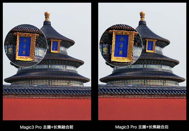 基于这一困局,荣耀Magic3系列在行业内首次做到全镜头参与,全焦段融合的计算摄影,在广角焦段,采用了彩色主摄和超广角摄像头的融合;在1x(高清像素下),使用了彩色主摄和黑白摄像头融合;在长焦以下焦段,根据效果智能使用彩色主摄和长焦融合策略,长焦镜头使用了多帧融合,让用户最终实现全场景的高清拍摄体验。