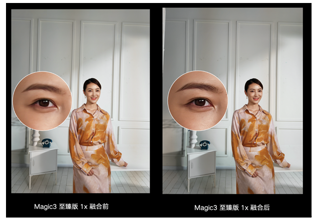为解决定焦镜头连续变焦所导致的中近焦段画质损失问题,提高中近焦段人像拍摄的成像质量,荣耀Magic3 Pro和荣耀Magic3至臻版带来彩色主摄与长焦镜头融合方案,通过长焦镜头来增加主摄拍摄图片中间部分的清晰度,可以覆盖54-94mm焦段,使变焦成像清晰度最大提升180%。