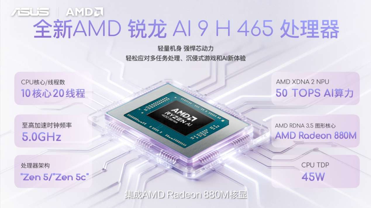性能方面,它搭载AMD锐龙AI 9 H 465处理器,在性能与轻薄之间实现突破式平衡。该处理器采用10核心20线程设计,支持多线程多任务处理更快,满足多任务办公、游戏娱乐追剧、轻度创作、深度学习等用机场景需求,集成AMD高能集显Radeon 880M,拥有12CU图形核心,不仅支持视频AV1硬件编解码,还能畅玩主流MOBA、FPS游戏,娱乐办公两不误。依托华硕专业调校技术,基于采用内吹风道、双风扇以及双热管设计的华硕冰锋散热架构,990g极致轻薄机身实现至高45W强劲性能释放,突破轻薄本性能上限。