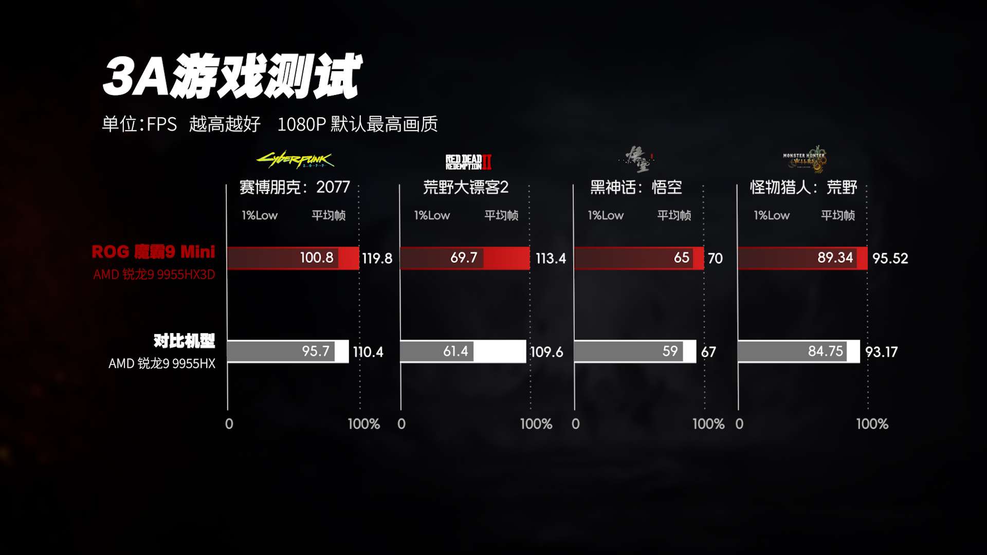 在1080p分辨率下,GPU的瓶颈基本被消除,CPU对游戏性能的影响被进一步放大。以《赛博朋克2077》《黑神话:悟空》这类偏重GPU的3A游戏为例,锐龙9 9955HX3D相比9955HX的平均帧率提升并不夸张,但帧时间曲线更平滑,最低帧表现更稳定。