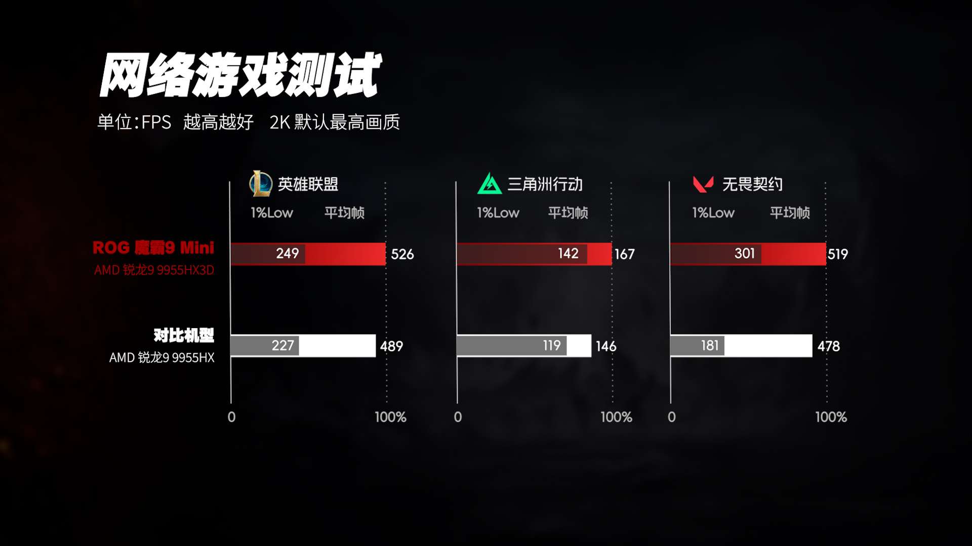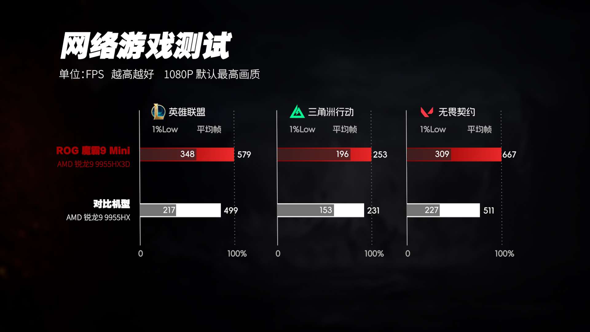 真正拉开差距的,是《CS2》《英雄联盟》等对延迟高度敏感的电竞游戏。在这些场景中,锐龙9 9955HX3D的1%Low帧明显更高,团战、烟雾、单位密集时的帧率波动更小,画面抖动与瞬时掉帧的情况显著减少。这类差异很难通过平均帧率直接体现,但对实际操作手感影响非常直接。