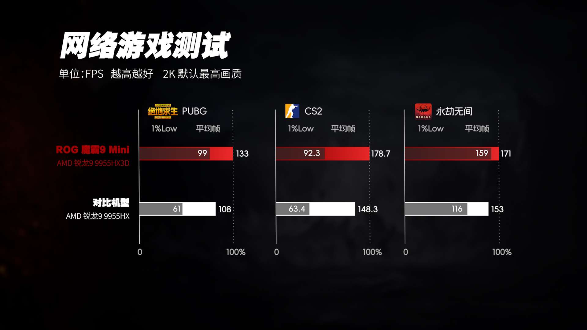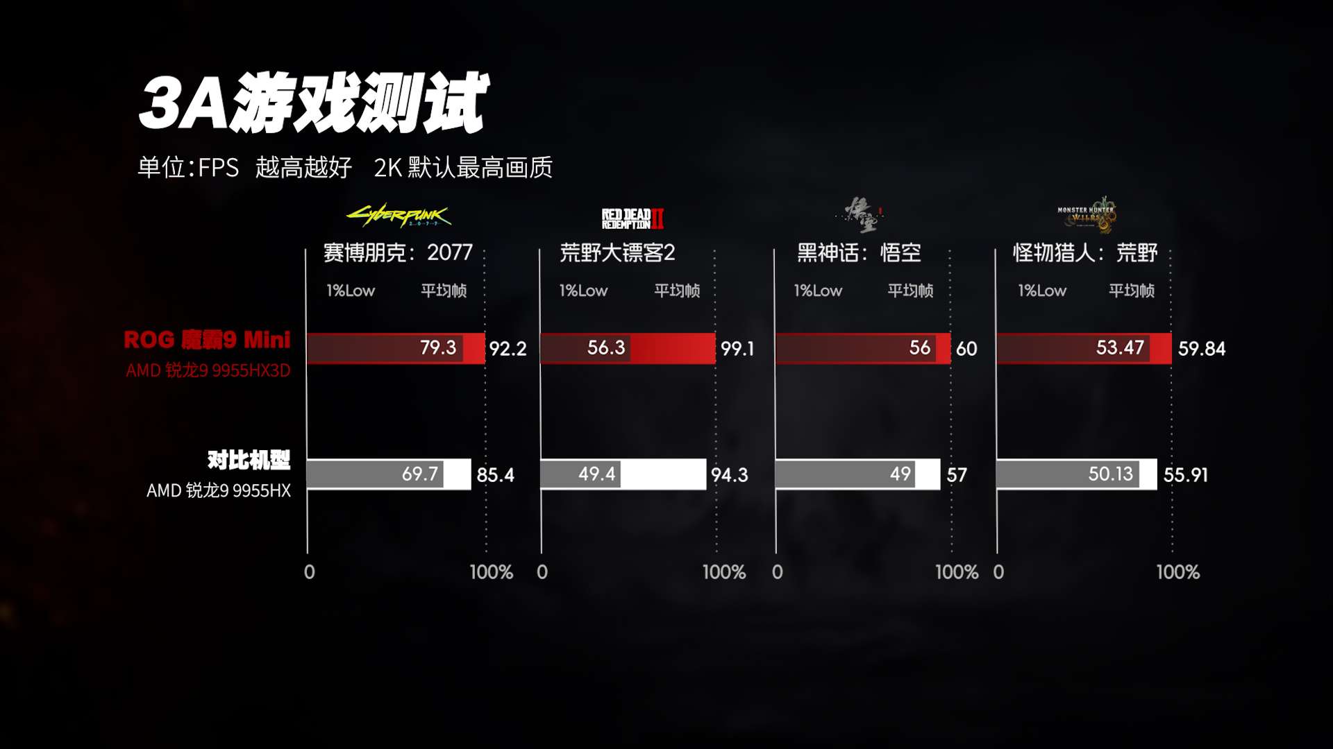在2K分辨率下,GPU负载明显上升,RTX 5070 Laptop成为性能瓶颈的主要来源。即便如此,锐龙9 9955HX3D依然能够通过更稳定的数据供给,帮助显卡维持更完整的性能输出,避免在复杂场景中出现“喂不饱”的情况。