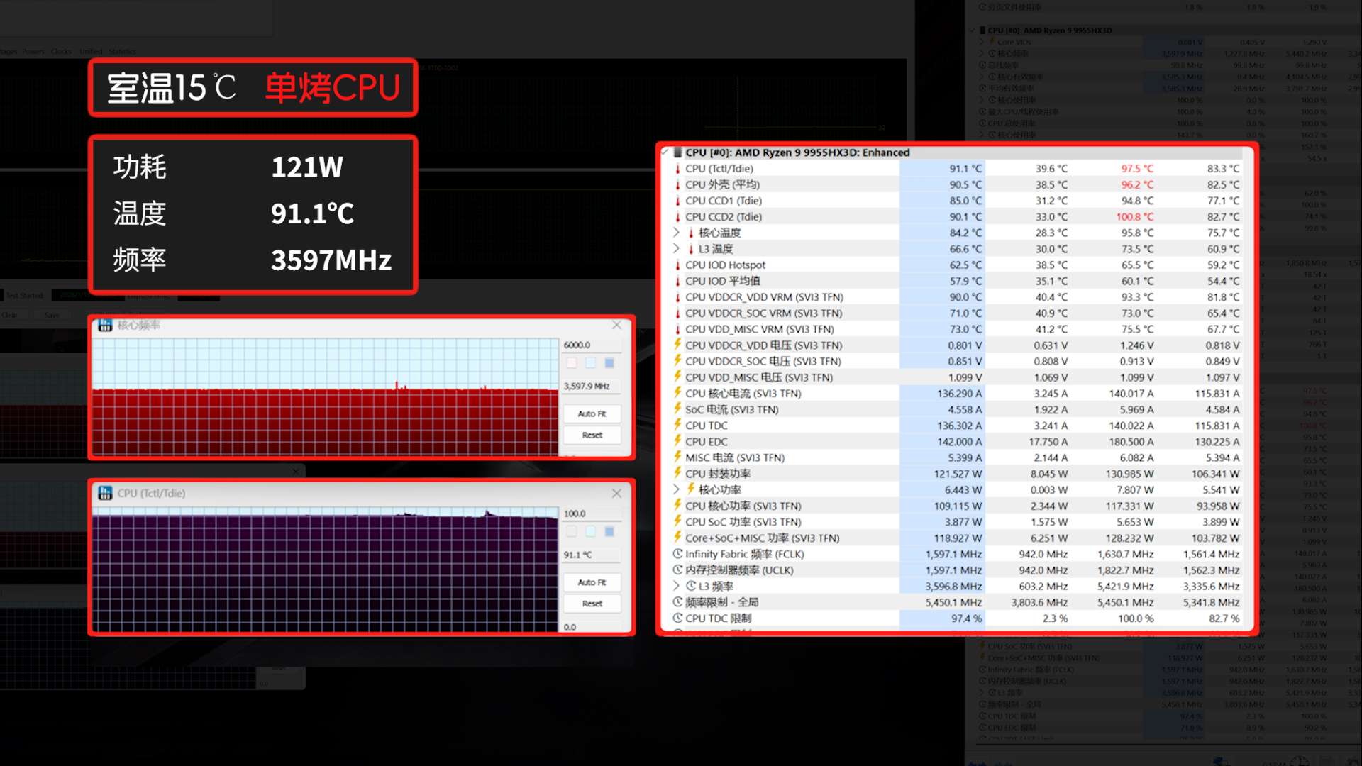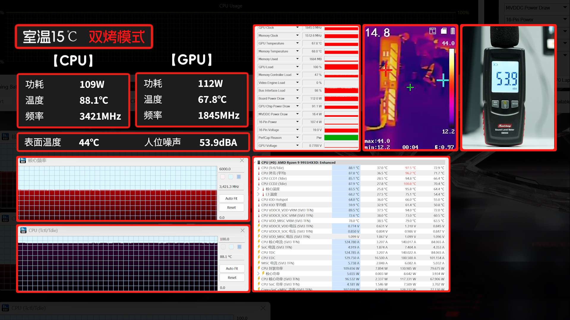 在烤机测试中,单烤CPU时,锐龙9 9955HX3D的频率保持稳定,没有明显波动;双烤状态下,风噪有所提升,但并未出现刺耳啸叫,机身表面温度控制在合理范围内,且未观察到因过热导致的降频现象。这说明其散热设计具备足够余量,能够支撑高负载下的持续运行。