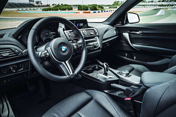 M2采用了宽大的19英寸轮圈,米其林专门为其提供了Pilot Super Sport高性能轮胎。同时车身颜色还有阿尔卑斯山白、宝石黑、矿物灰以及长滩蓝4种颜色供挑选。与充满激情的外观相比,BMW M2的内饰有些缺乏新意了,M2采用了M3/M4标志性的内饰设计风格.方向盘依然延续了M家族的通用样式.蓝色缝线的真皮座椅可以说成为了M2在内饰方面淮一标新立异设计的地方。