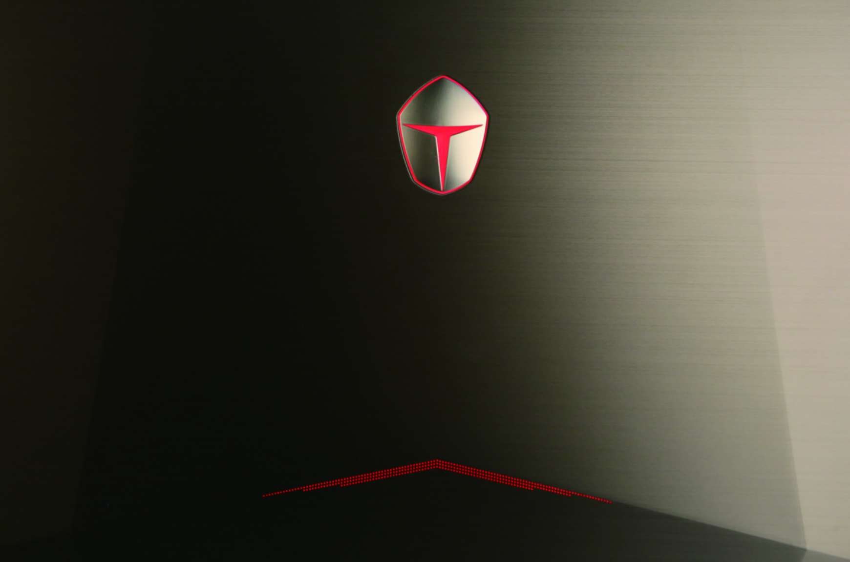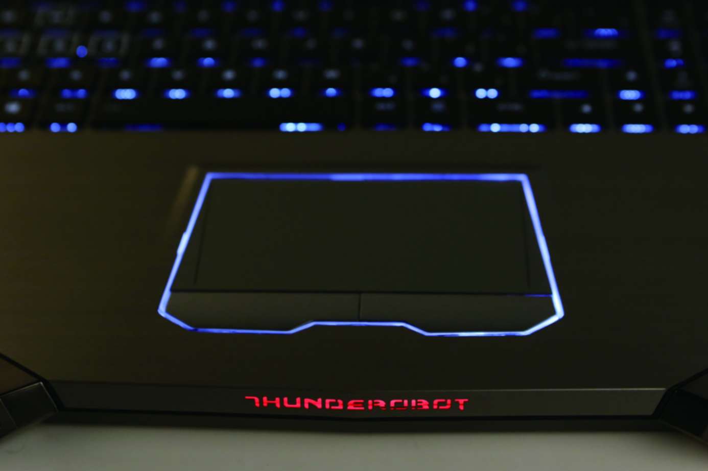 棱角分明的造型已经逼格十足,雷神的设计师们自然不会忘记为它加上画龙点睛的灯效:C面的键盘和触摸板都采用了柔和的白色背光(触摸板的背光会随着系统温度的增加变更为红色),类似跑车仪表盘的灯效;C面边缘的“Thunderbot”则采用和跑车尾灯一样的红色灯效。A面的Logo红色灯效则采用呼吸灯设计。