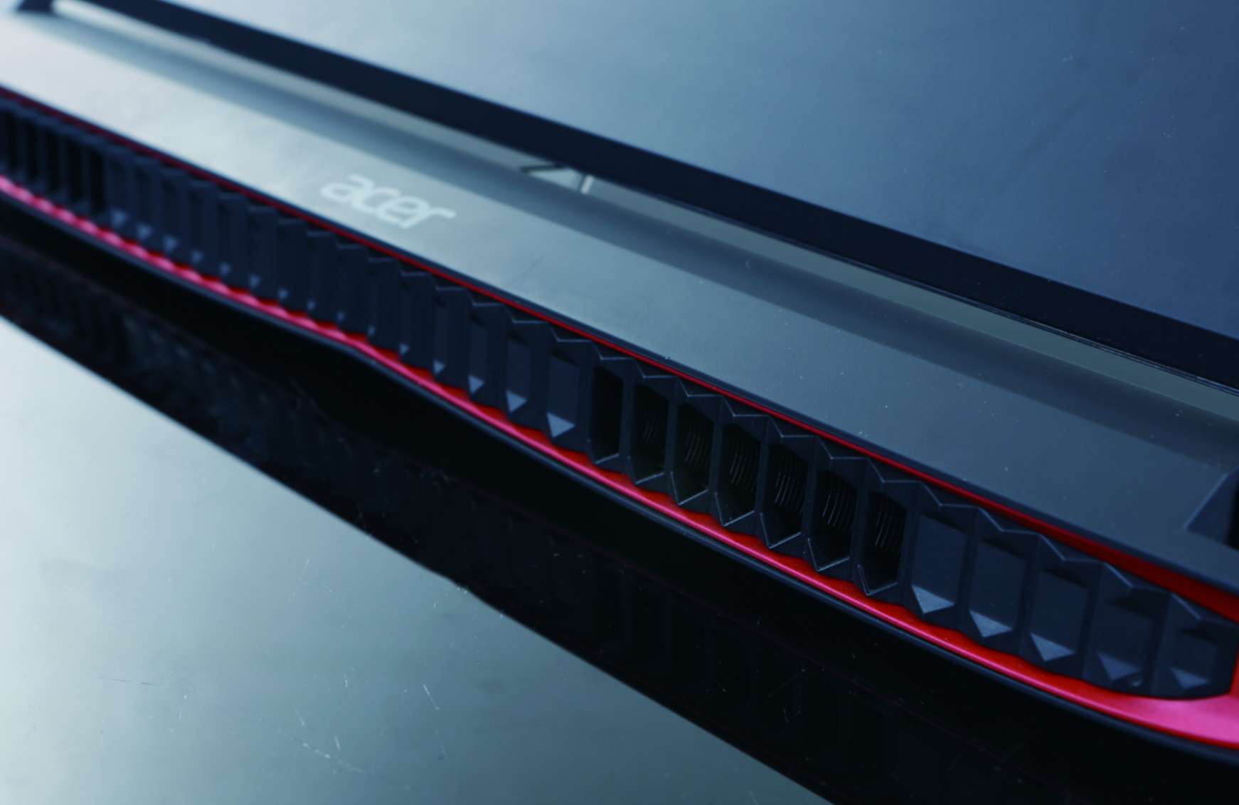 Predator的外观灵感同样来自于超跑,背部类似超跑前档的夸张的竖格散热孔以及前面如车灯一样的多边形扬声器都是这一灵感的最好体现。曾经在各种机身材料之间玩了个遍的宏碁并没有在Predator G9-791上使用金属材质,而是使用了PC+玻璃纤维(据说1.8mm厚的PC+玻璃纤维形变只有2.76mm,比0.8mm厚的5052铝合金的2.93mm形变还要略好),同时还能带来更好的无线信号,并且实现了细腻的类肤手感和红黑配色。