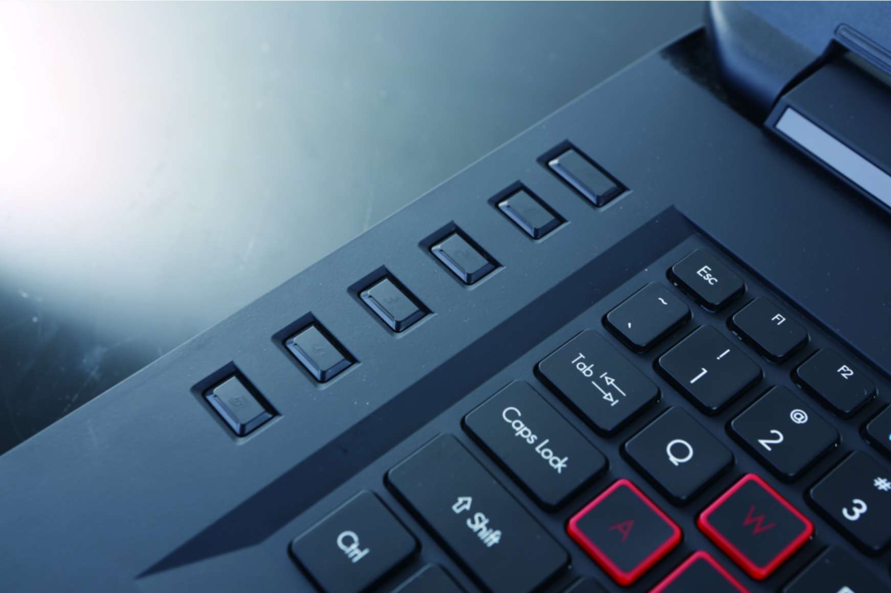 说到灯光,Predator G9-791虽然是游戏本里的后辈,却把灯效玩得比前辈们更溜:除了A面的红光Logo和灯带,C面键盘区还采用了双色背光,红光的主键盘区和蓝光的小键盘区彼此映衬,且一共分为四个可以独立开关背光的分区,并且可以自定义在不同游戏中的灯效——这绝对是迄今为止笔记本上的首创。不仅如此,位于键盘左侧的宏键、WASD以及上下左右这几组游戏中最常用的按键都采用了高亮设计。这里必须要提一下Predator Sense这个控制台,除了前面提到的背光控制外,它还可以监控系统信息,并且为5个宏键设定各种快捷英语或操作宏——总共可设定3组15个指令,完全不输给专业的游戏机械键盘。