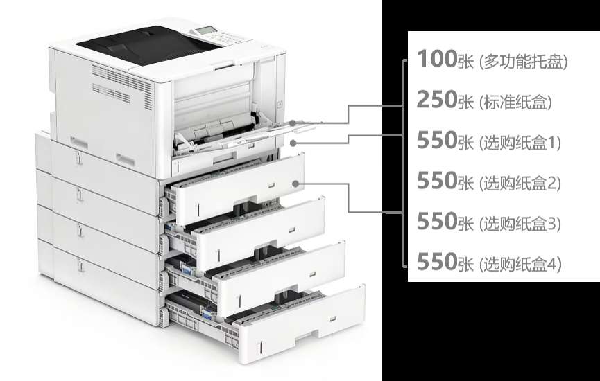 LBP811Cx支持6种以上纸张,进纸容量最高可达2,550张