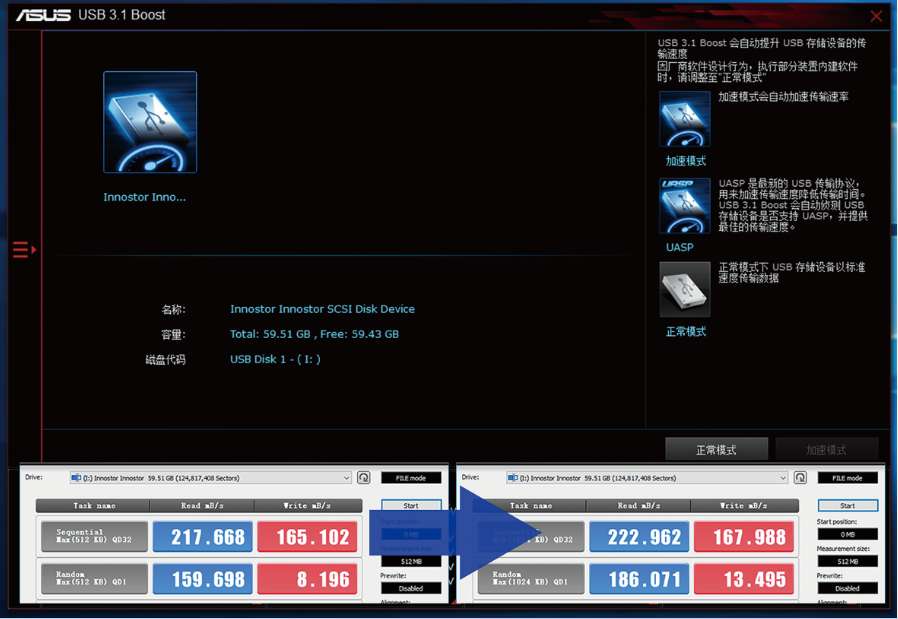 USB 3.1 Boost功能实测,一键开启UASP协议后闪存盘读写性能有所提升。