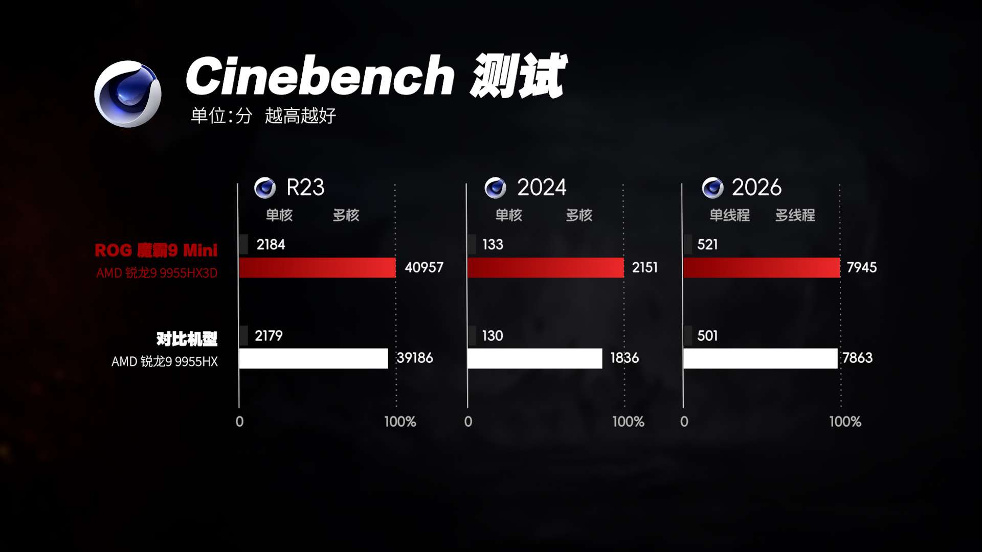 但这组测试的意义并不在于“谁更强”,而在于确认一件事:在魔霸9 Mini的紧凑体积与散热条件下,锐龙9 9955HX3D并没有出现性能释放受限的问题,它在基础算力层面仍是稳定、完整的。这也为后续游戏测试提供了一个可靠前提。
